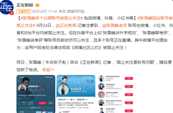 就在一个月前,张雪峰的所有主流平台账号,包括微博、抖音、B站、快手、小红书集体“异常”,页面显示“禁止关注”。