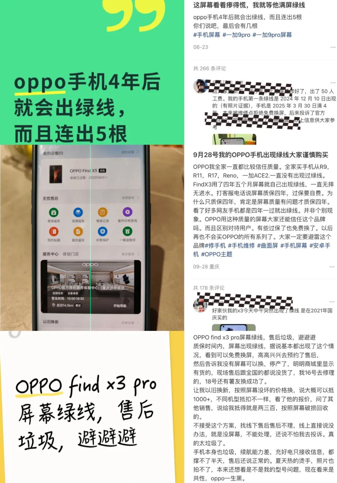 在黑猫投诉中,以“OPPO”为关键词的帖子共计2万余条,其中明确提到“屏幕绿线”的多达500余条,在媒体公开报道中同样曝光了多起这样的案例,几乎可以认定这是一起较大规模的关乎产品质量的“绿线门”危机。