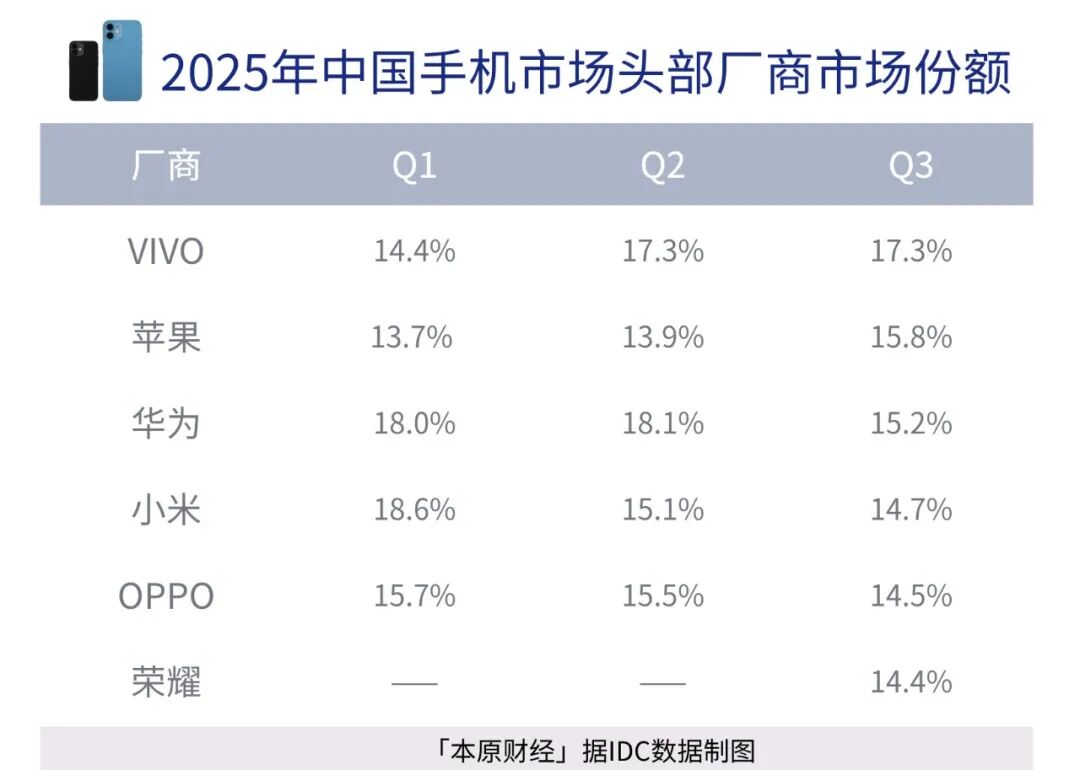 但站在宏观角度复盘其成绩,却早已隐忧暗藏。在高端智能手机领域,OPPO已从中国市场前三中跌出,保五争四;在全球市场同样不乐观,IDC数据显示,OPP手机2025年第一季度市场份额排全球第四,到第三季度已跌出全球前五,沦为 “其他” 序列。
