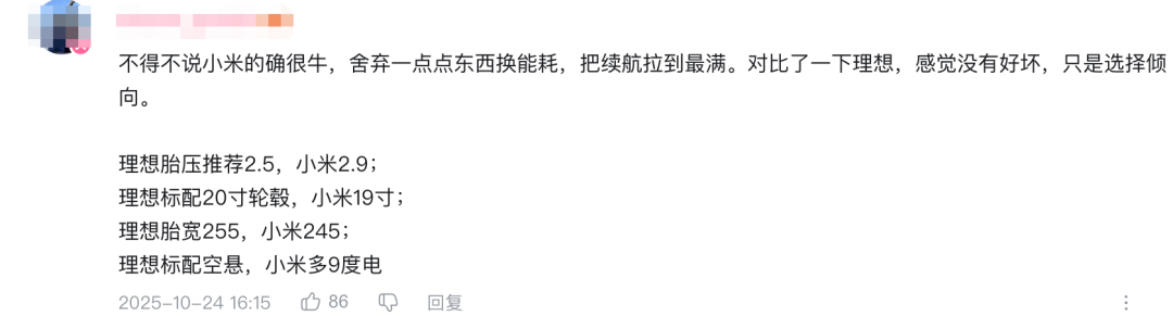 “不得不说小米的确很牛,舍弃一点点东西换能耗,把续航拉到最满。对比了一下理想,感觉没有好坏,只是选择倾向。”