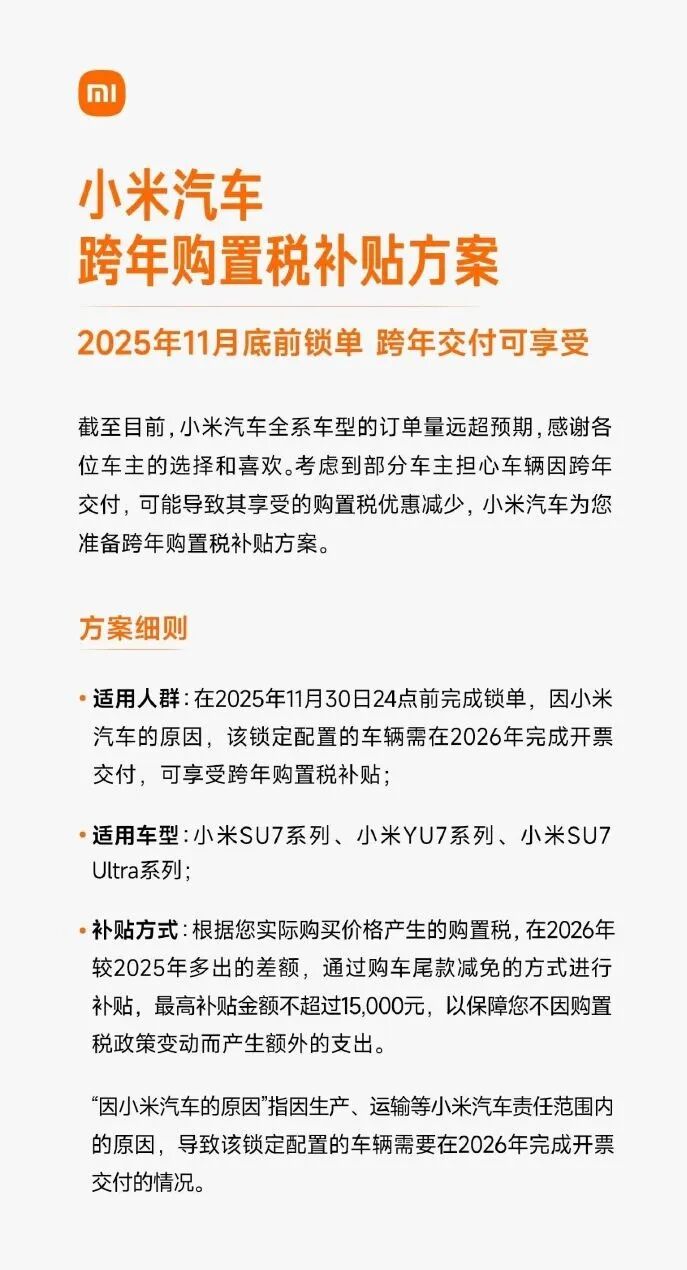 就在YU7刷屏的同时,小米汽车还官宣了一项“跨年购置税补贴计划”:凡在2025年11月30日前锁单、因厂家原因延迟至2026年交付的用户,小米将补贴购置税差额,最高1.5万元,全系适用,包括SU7、YU7、SU7 Ultra等。