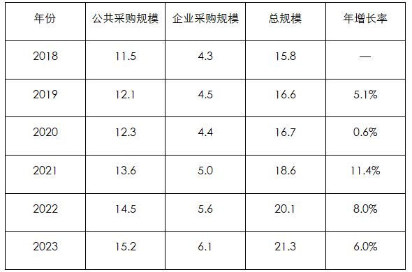 表:2018–2023年全球招投标市场规模(单位:万亿美元)