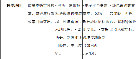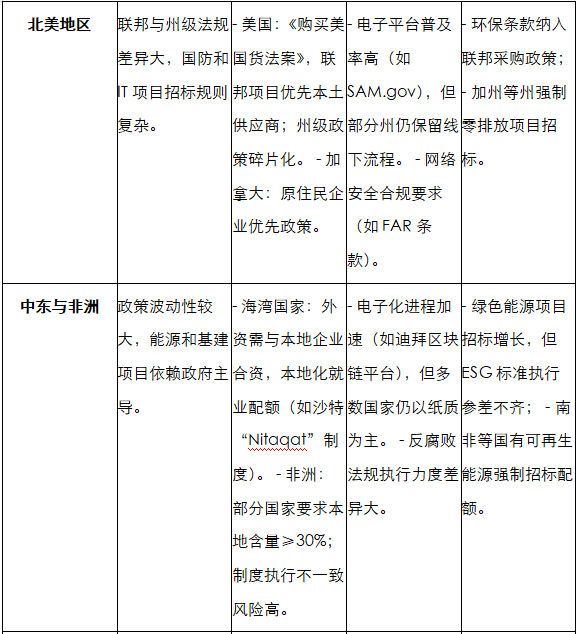 政策法规是招投标行业的“指挥棒”,近年来全球政策环境呈现“规范化、绿色化、数字化、开放化”趋势。除国际规则和主要国家政策外,不同区域在市场准入、本地化要求、数字化标准等方面存在显著差异,直接影响企业跨境参与招投标的合规成本和策略选择。