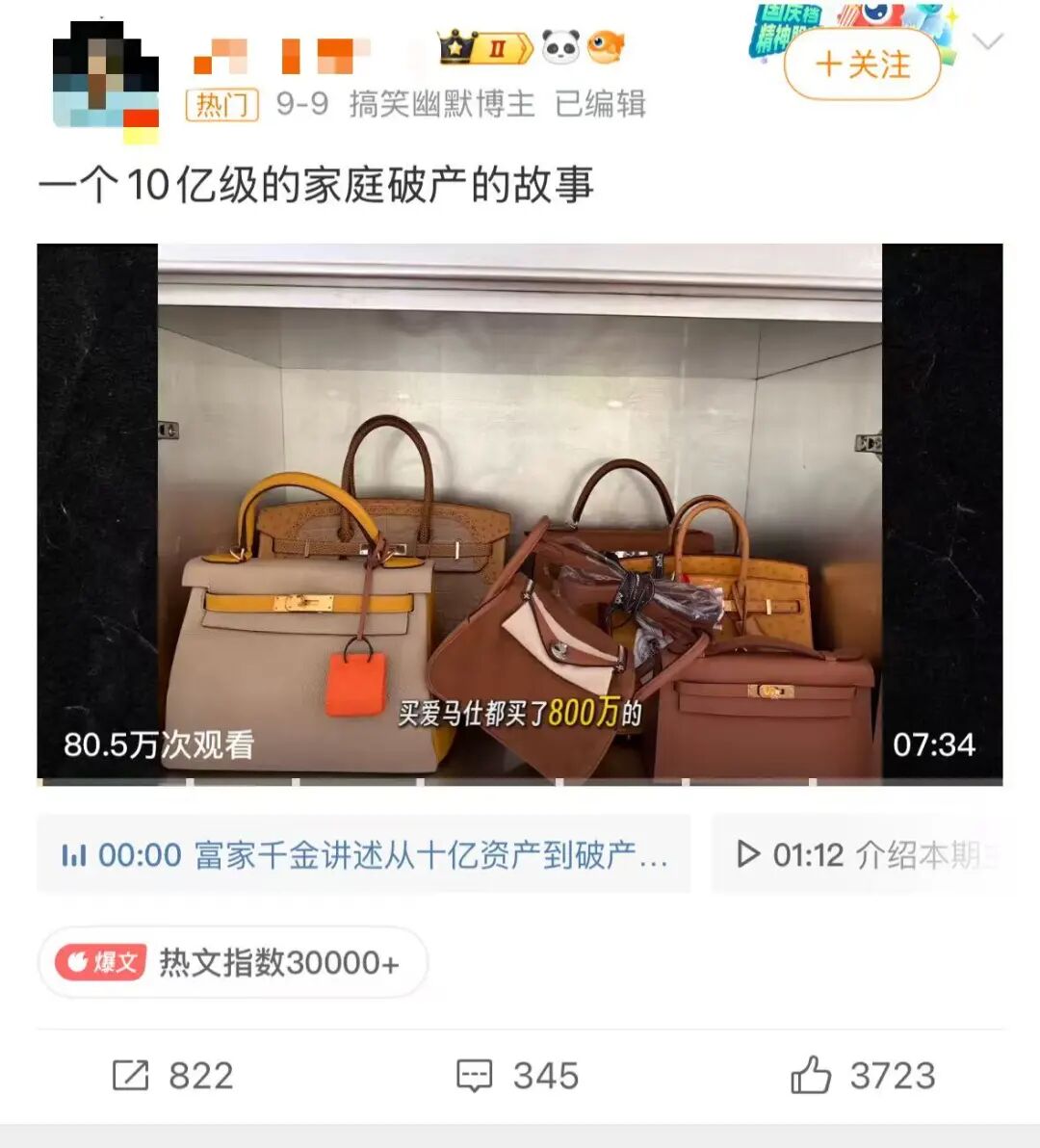 这是“真”破产博主的共性。在他们的黄金时代,本人或家族真正富过,有过一掷千金的豪气。破产之后,他们穷得只剩下一整墙的限量爱马仕和满车库的超跑豪车。就比如“负家千金”,虽然已经变卖过很多包包、首饰填补家用,但手里也还有不少翡翠玉石之类的贬值奢侈品。低价卖出可惜,索性留下给自己提供情绪价值。