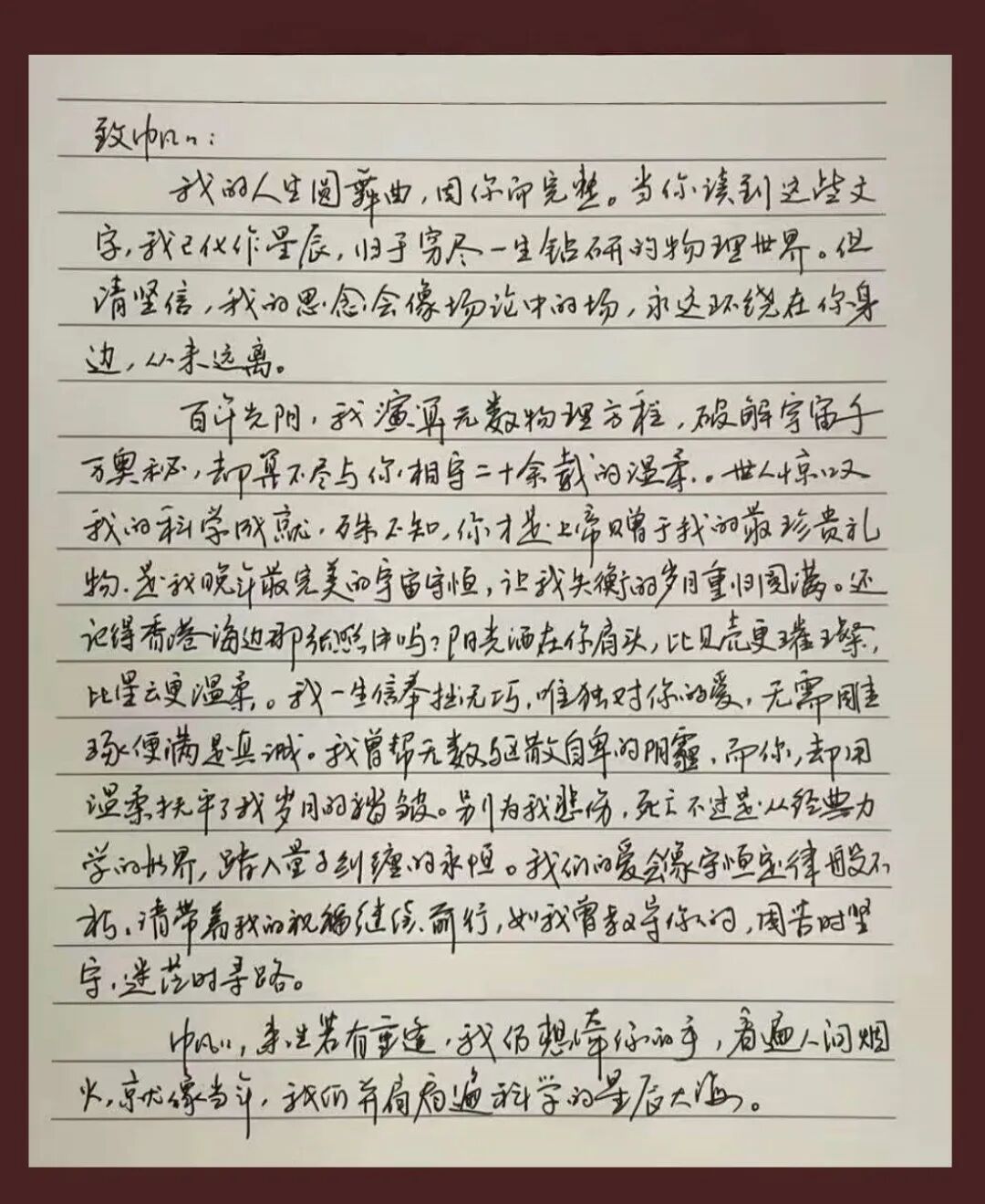 而网上流传的永别信,什么“我的人生圆舞曲,因你而完整”“我验算无数物理方程,破解宇宙千万奥秘”……