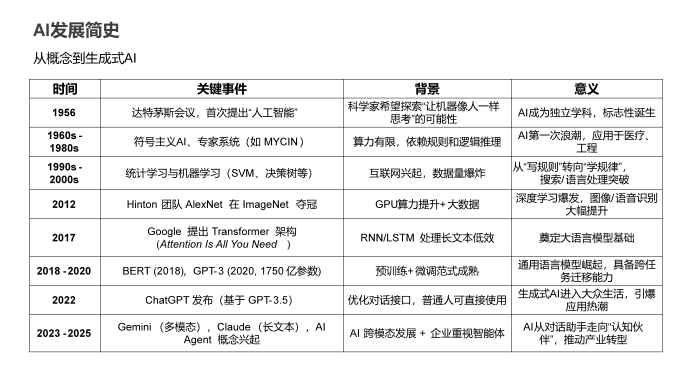 人工智能发展实际有几十年,早在1956年达特茅斯会议,专家提出人工智能概念,从此开始到符号主义AI;到统计与机器学习;到2012年ALEXNET问世,在图像识别取得重大突破;到GOOGLE在2017年提出“Transformer”架构,建立注意力机制,帮助机器更加高阶、更加系统识别上下文,输出更为精准的答案;到2022年生成式AI爆发,进入大众使用阶段,人们可以通过自然语言与大模型对话,帮助人们生成内容。