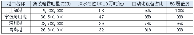 中国港口基础设施建设水平世界领先,深水泊位、自动化码头、大型装卸设备等不断投入,港口通过能力持续提升。智慧港口建设取得显著进展,信息化、智能化水平不断提高。