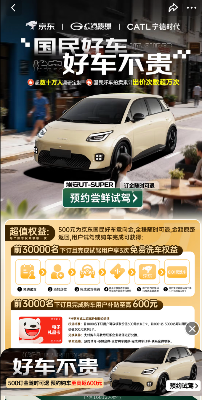 据了解,这款车将于11月9日正式发布,用户已可在京东App搜索“国民好车”进行预订,还能享受E卡补贴与免费洗车等权益。