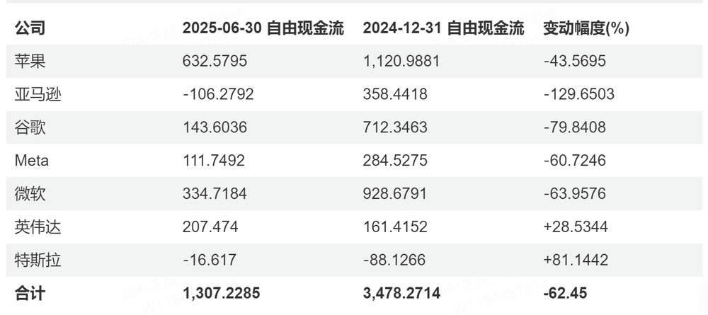 截至2025年第二季度,“七巨头”的自由现金流总额已较2024年年底下降了62.45%。