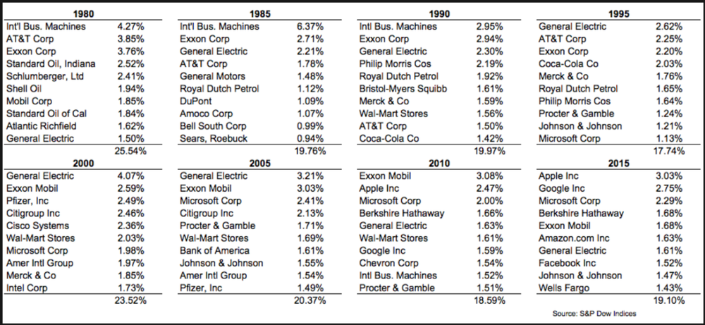 此前,前10大权重股占比最高的时候是2000年的互联网泡沫阶段,比重为23.52%。当时的前10大权重股有:通用电气、埃克森美孚、辉瑞、花旗集团、思科系统、沃尔玛、微软、美国国际集团、默沙东、英特尔。