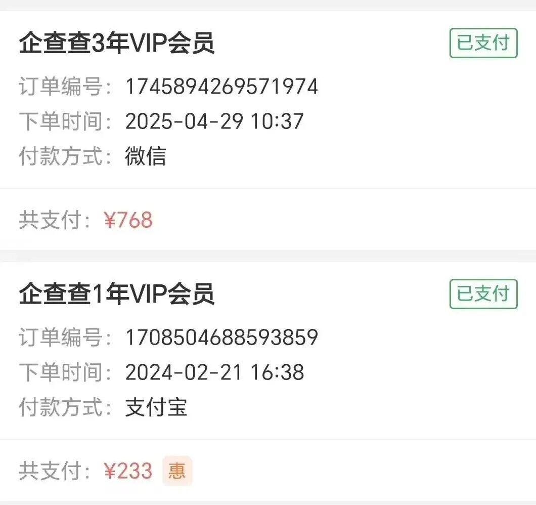 不少用户声称,在不知情的情况下被扣除了数百甚至上千元的会员费,“2025年10月10日晚,手机未锁屏放在口袋,莫名从支付宝跳到企查查会员付款页面,手机拿出来,直接人脸识别付款成功,申请退款,商家处理后,退款未到账……”