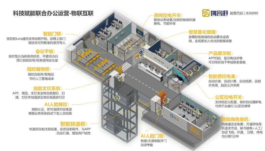 创富港共享办公空间全面引入物联网技术,打造智能化办公体验: