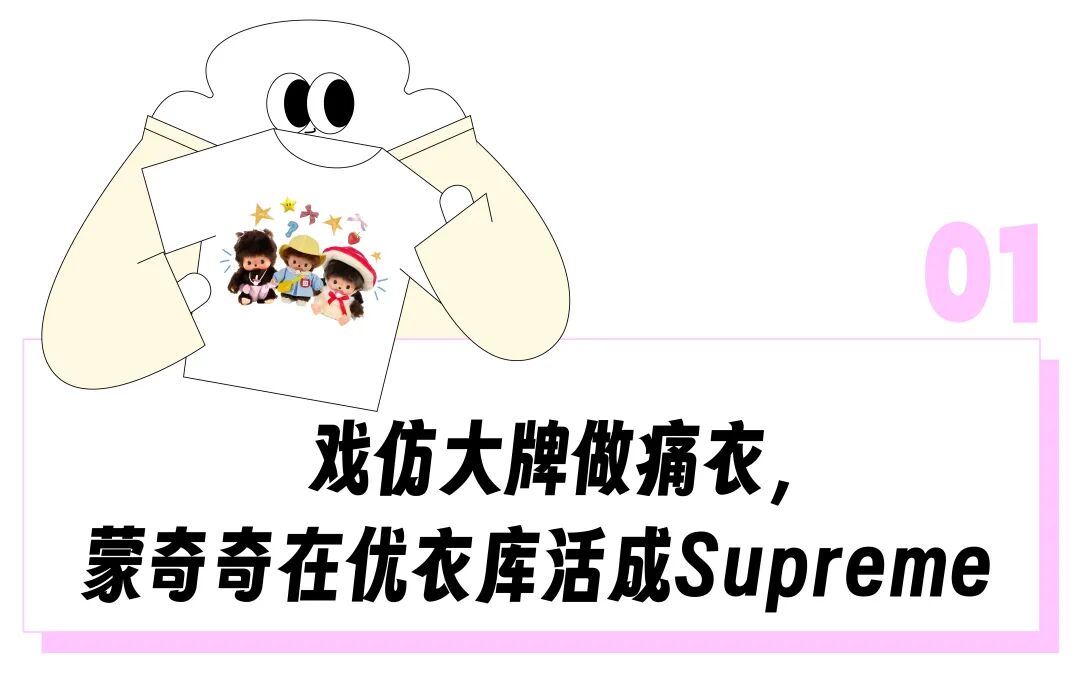 还有很多朋克青年,对蒙奇奇的开发已经不局限于戏仿大牌或追星,而是借蒙奇奇之口把优衣库白T做成了态度潮牌。