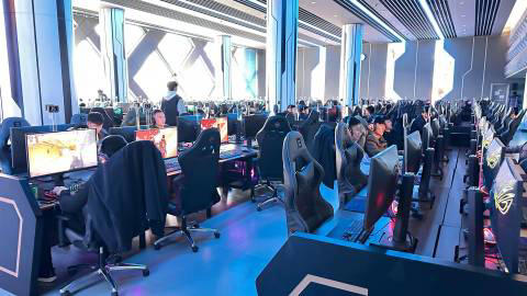 就装修风格来说,很有国内大型网咖的味道了,可以同时容纳300台机。其中一部分区域,很像电竞基地了。它的电脑配置也非常高,全部都是清一色的高配游戏机,以华硕电竞品牌为主。