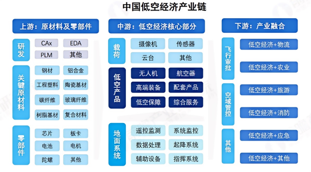 下游应用层包含运营服务、保障服务以及各行业应用解决方案,是产业价值实现的关键。在这个环节,飞行审批、空域管控、基础保障、运营维修等构成了完整的服务链条。