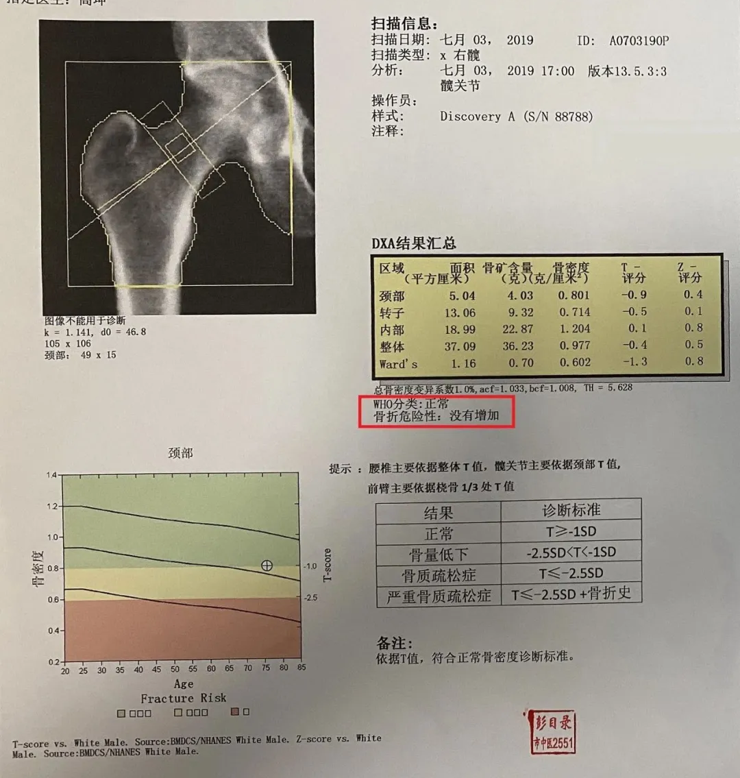 在定期检查中,结果显示骨密度正常,没有骨折风险。
