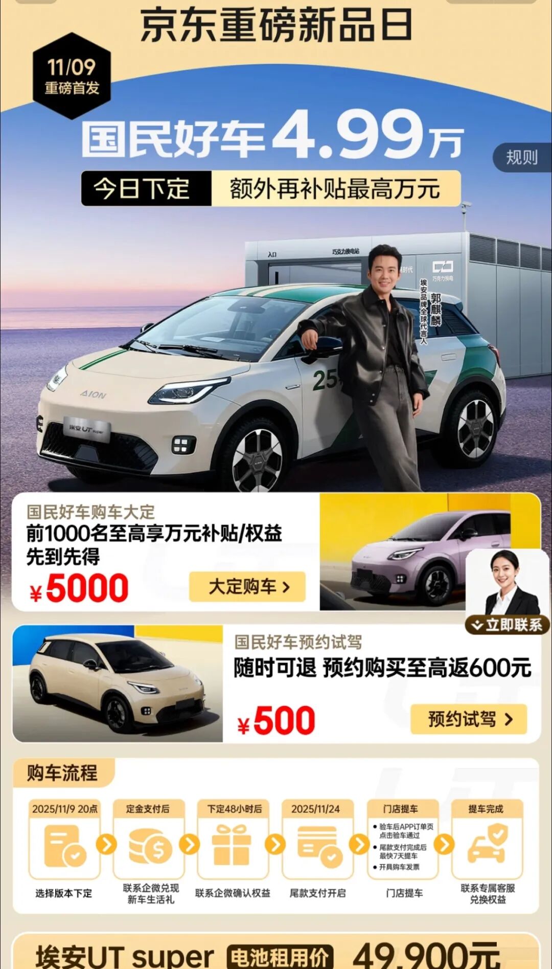11月9日,京东联合广汽集团与宁德时代发布的首款“国民好车”——埃安UT Super价格正式公布。