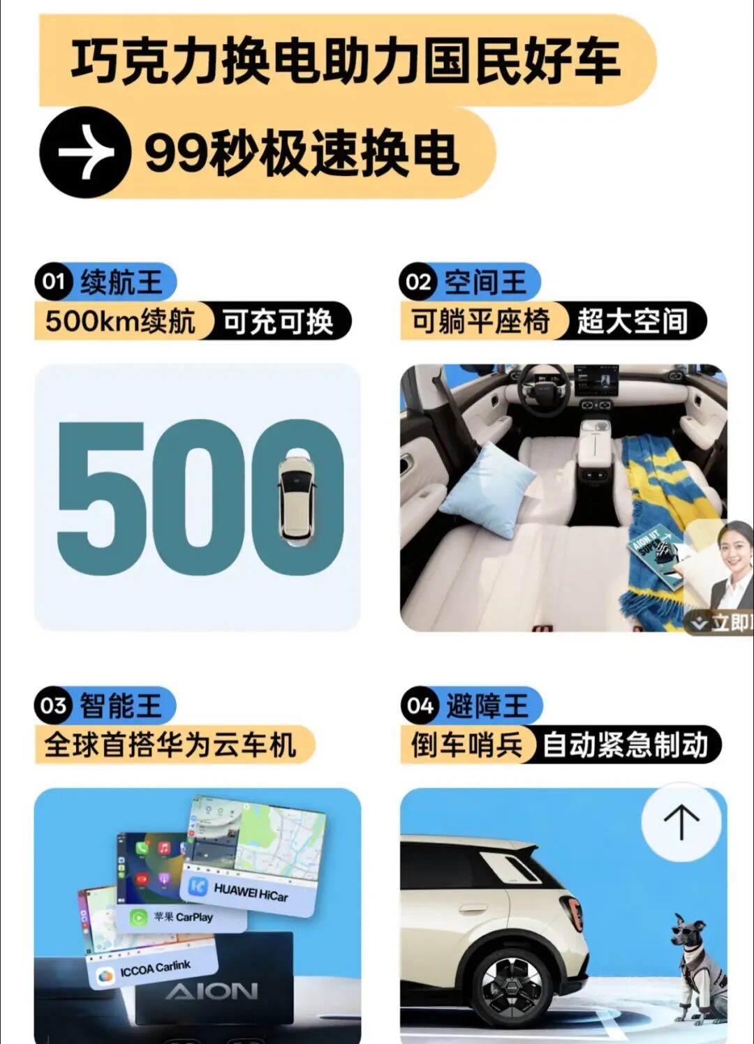 500公里续航、86秒换电、2750mm的轴距,这个价格确实太香了,相信会对蔚来的萤火虫、MG4等同价位造成压力。