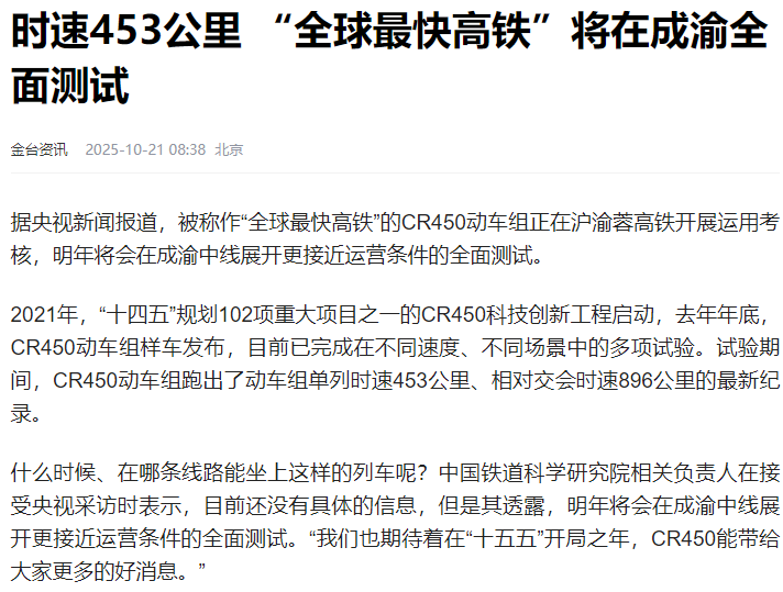 被称为“全球最快高铁”的CR450动车组正在沪渝蓉高铁开展运用考核。明年将在成渝中线高铁全面测试。从去年底样车下线以来,它就一直在进行各种的达标考试,经过一轮又一轮的周考、月考、期中考,已经交出了时速450公里的答卷,各项指标都已经合格,但是考试还得继续,因为按照技术要求,CR450要在指标合格的前提下,跑够60万公里,才能够载客运营。目前,CR450正在湖北“刷里程”。央视新闻透露,CR450每天会从宜昌北站开始,到荆门、汉川等站的近300公里的线路上折返跑。这条线路,正是沪渝蓉高铁的湖北段之一。CR450和传统的动车组不太一样:车头更长、更尖,质量更轻,底盘更低。目前时速350公里的动车组,车头长12.5米,CR450动车组则延长到15米。车头更尖更细了,阻力小了。转向架全包覆,车厢底部的裙板更低了。还有它的身高降低了20厘米,体重减轻了50吨。近五年来,研发人员以0.1%的减阻率为最小单位,一点点持续精进,最终让整列车的阻力减小了22%。按照规划,明年将会在成渝中线展开更接近运营条件的全面测试。同时,今年7月份召开的国新办发布会上,国家铁路局相关负责人首次对外披露,正在建设的成渝中线高铁,开通之后将实现以时速400公里运营,到那时成渝之间可以50分钟通达。这意味着: