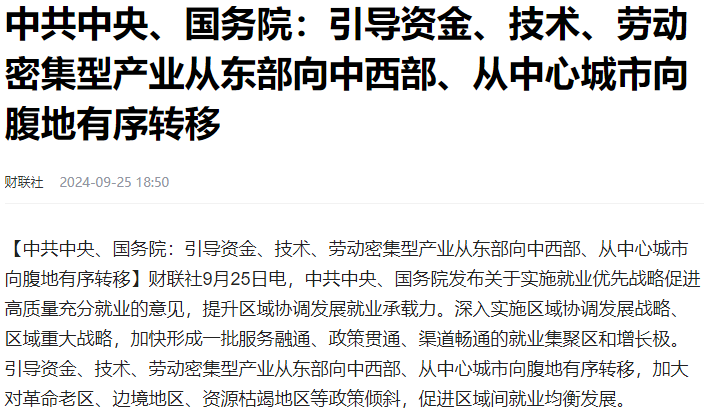 引导资金、技术、劳动密集型产业从东部向中西部、从中心城市向腹地有序转移,加大对革命老区、边境地区、资源枯竭地区等政策倾斜,促进区域间就业均衡发展。在新的世界格局与形势下,从国家战略安全考虑,管理层希望打造一个强大的、繁荣的西南地区作为中国的大后方。要知道,抗日战争期间,中国大后方的西南地区,保存了中国最后一点工业实力,为最后的翻身仗提供了希望与保障。