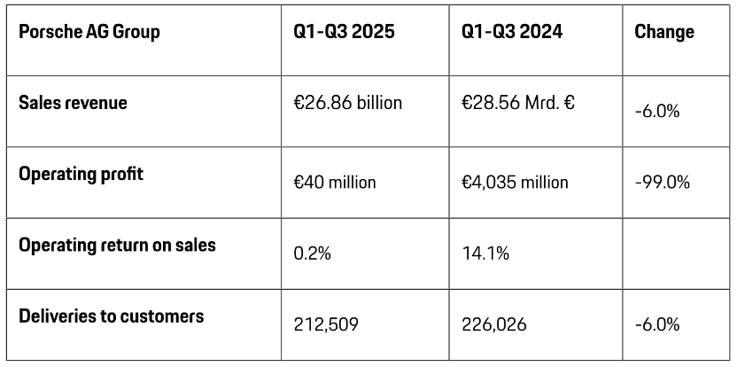 2025年10月24日,德国保时捷发布的季度财报震动了整个汽车行业。数据显示,今年前三季度,保时捷销售收入为268.6亿欧元,同比下降6%;经营利润仅4000万欧元,较去年同期的40.35亿欧元暴跌99%。第三季度甚至出现9.66亿欧元的经营亏损,而去年同期盈利9.74亿欧元。