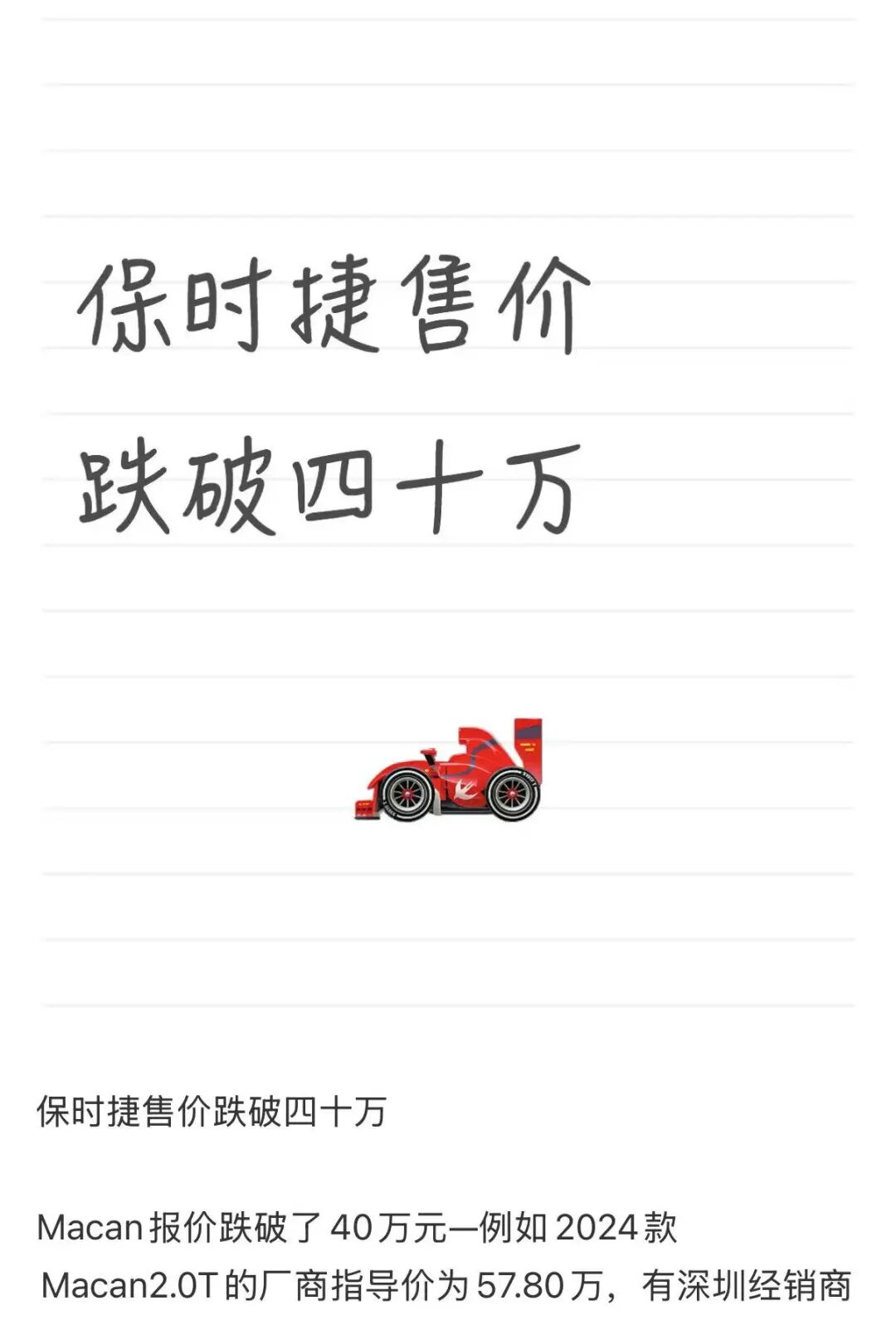 销量的下滑带动了价格的崩塌。过去需要加价才能提车的Macan,如今成了低价甩卖的代表。据新浪科技报道,去年第四季度,深圳某经销商将2024款Macan 2.0T的裸车价报至35.8万元,官方指导价则是57.8万元。