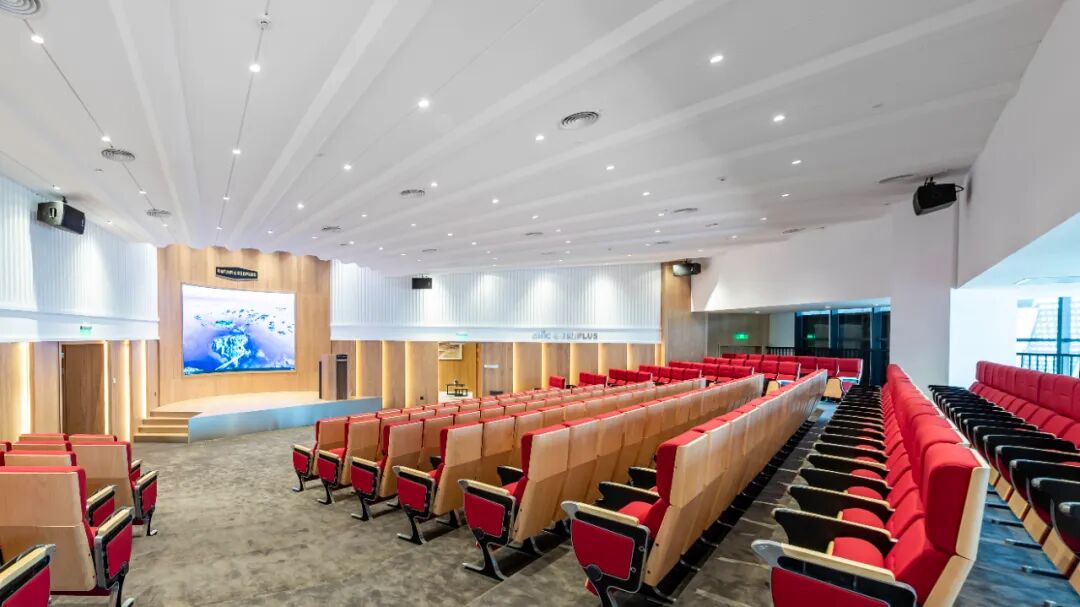 特色:剧院式会议厅,营造有质感的沉浸式体验,配备专业会议平板maxhub、HDMI数据线、幕布投影等专业会议设备。