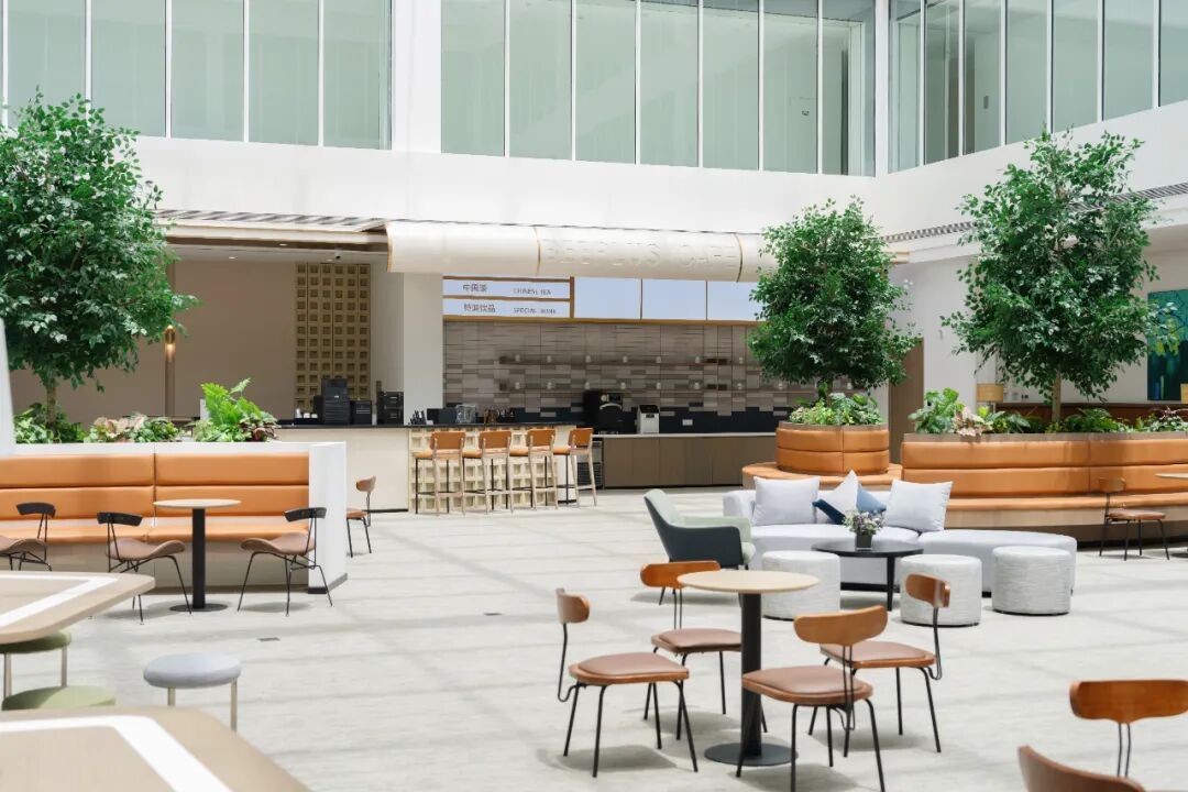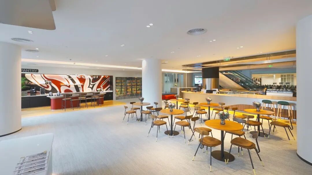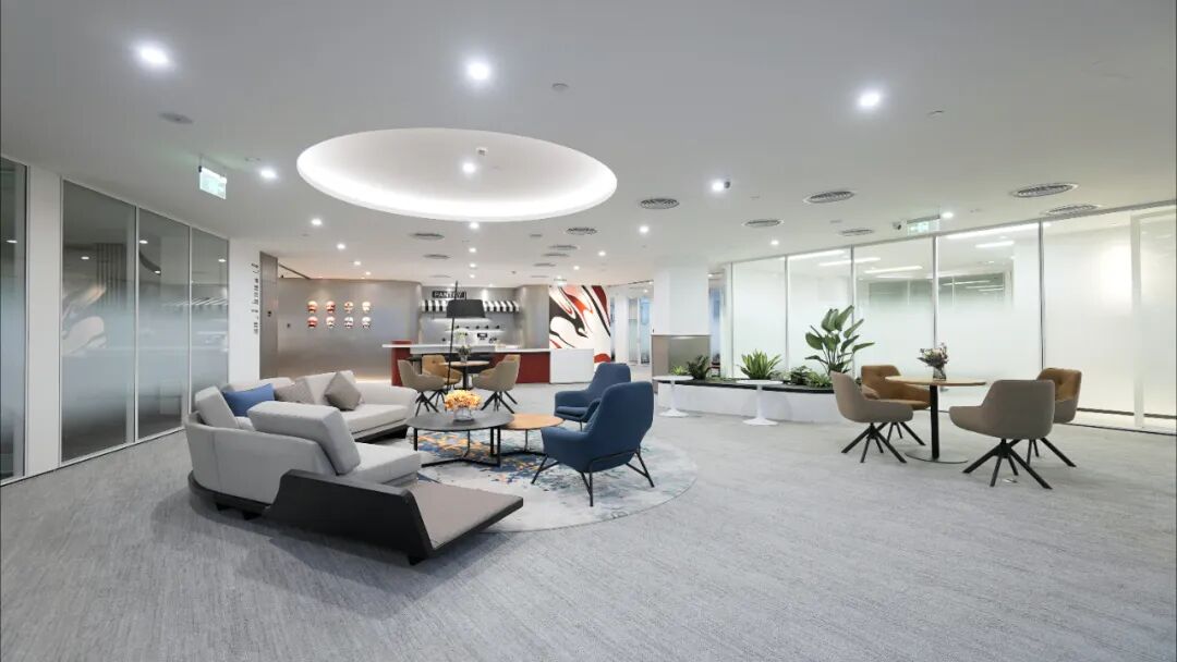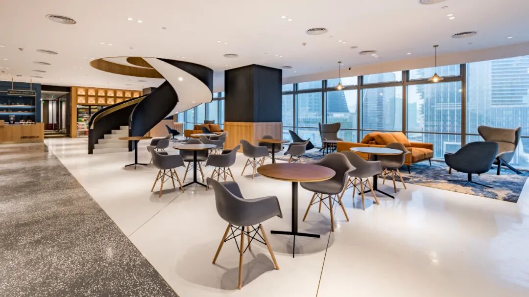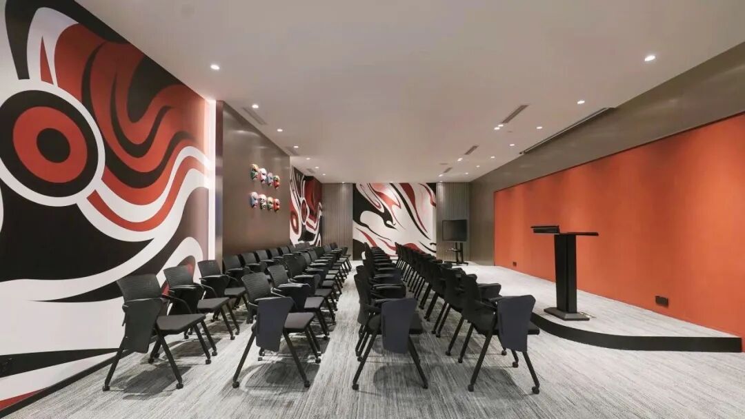 该中心坐拥优越地理位置,为地铁2号线金科北路站上盖物业。设计风格独具一格,打造贯通式 “休闲中庭”,带来极为开阔的视觉体验。整体以大面积高级银灰色为主调,点缀砖红色打破日常办公的沉闷感,墙纸中巧妙融入川剧脸谱元素,让空间兼具质感与鲜明的区域特色。