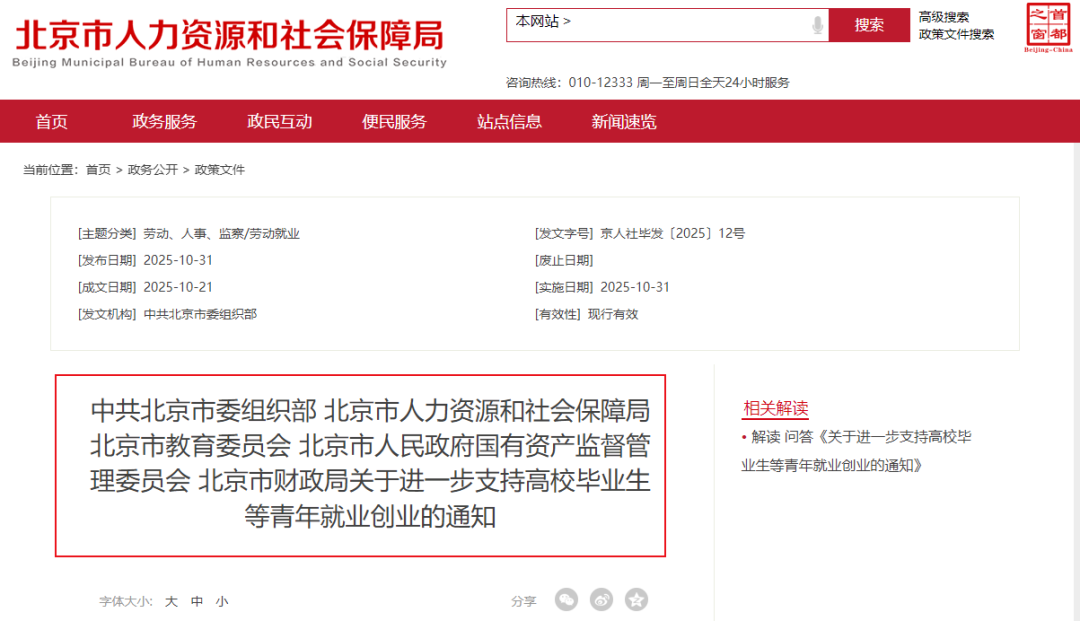 10月31日,北京市人社局、财政局等五部门联合发布了《关于进一步支持高校毕业生等青年就业创业的通知》,鼓励青年人才在京就业创业。