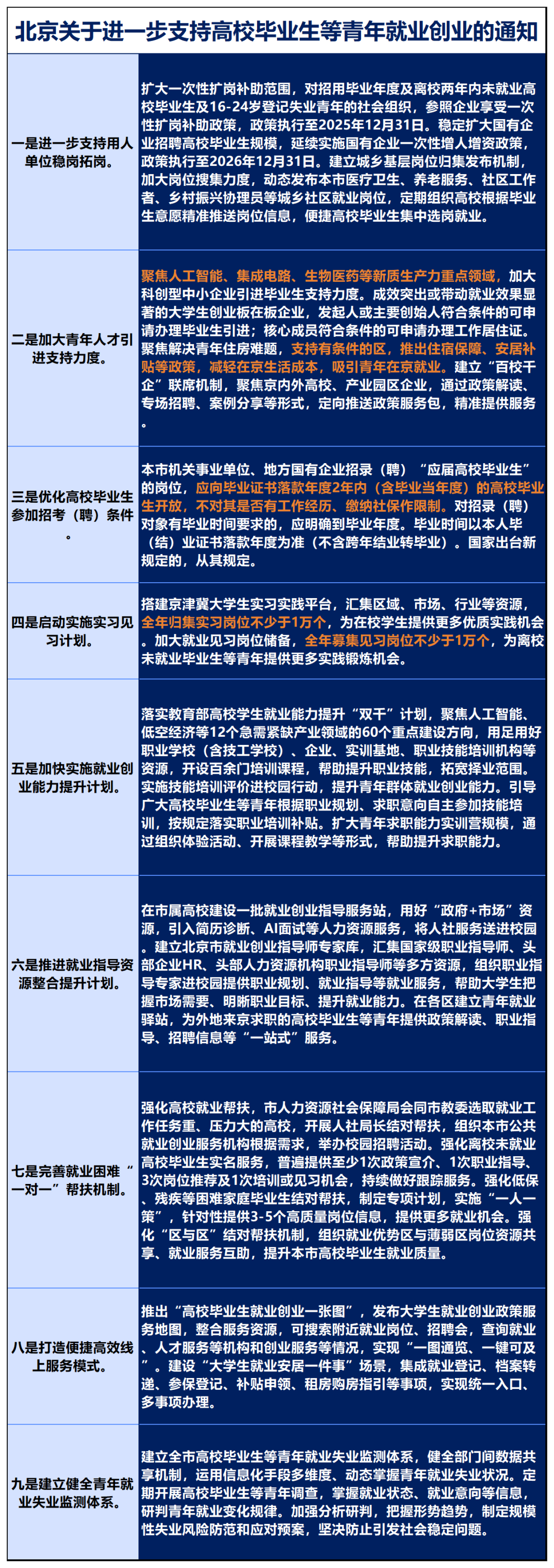 《通知》包括九条内容,如扩大一次性扩岗补助范围、加大青年人才引进支持力度、优化高校毕业生参加招考(聘)条件、启动实施实习见习计划等等。