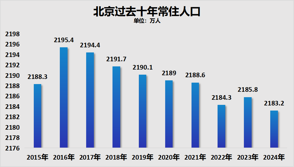 2024年北京的常住人口降至2183.2万人,较上一年减少了2.6万人。