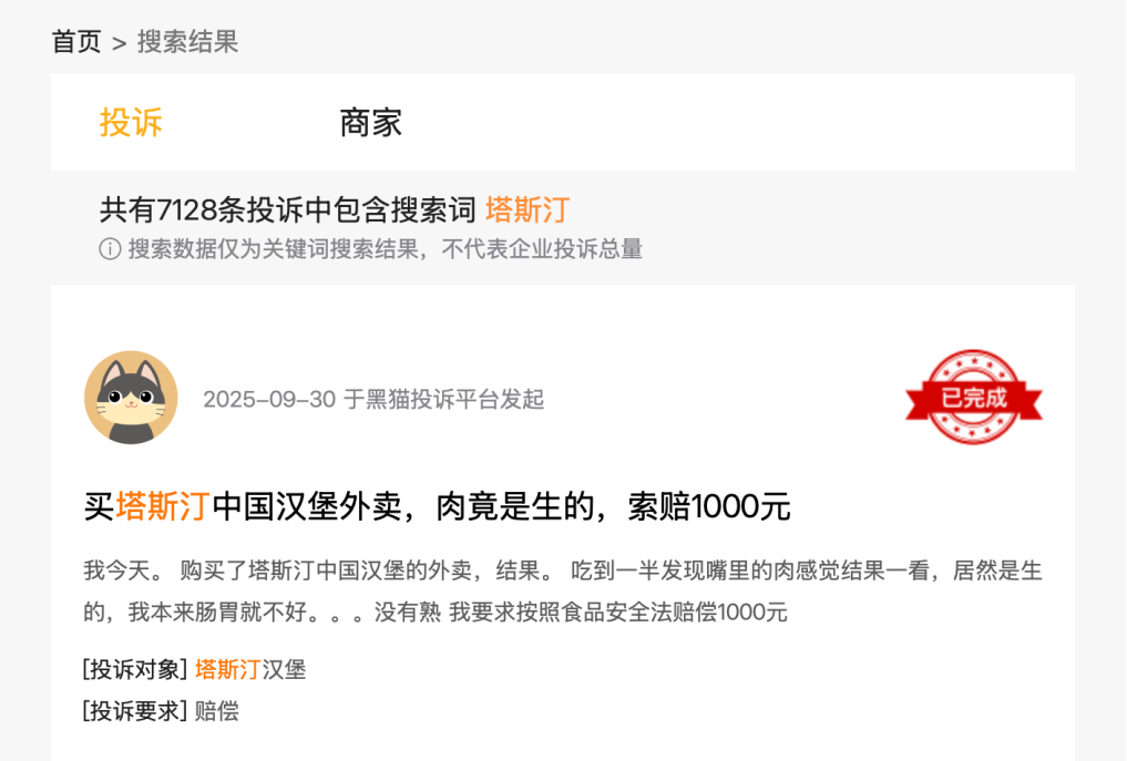 不过,目前塔斯汀依然存在不少食品安全问题。以黑猫投诉平台为例,目前与塔斯汀相关的投诉超过7000条,大多数与产品安质量,如食材不熟、吃出异物、食材变质有关。