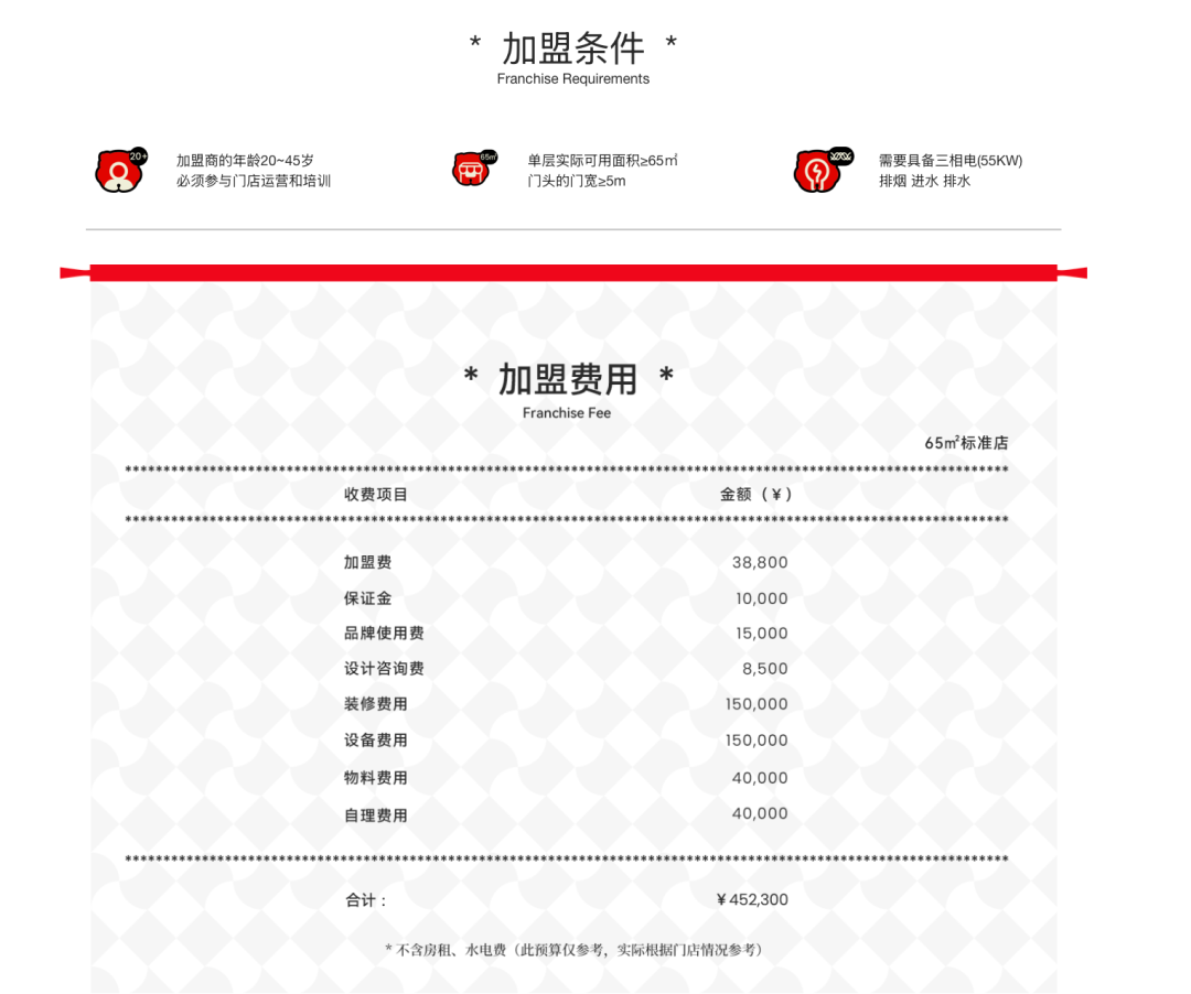 塔斯汀官网显示,包括目前加盟一家门店的投资费用为45.23万元,其中包括加盟费、保证金、品牌使用费、装修费和设计费等。