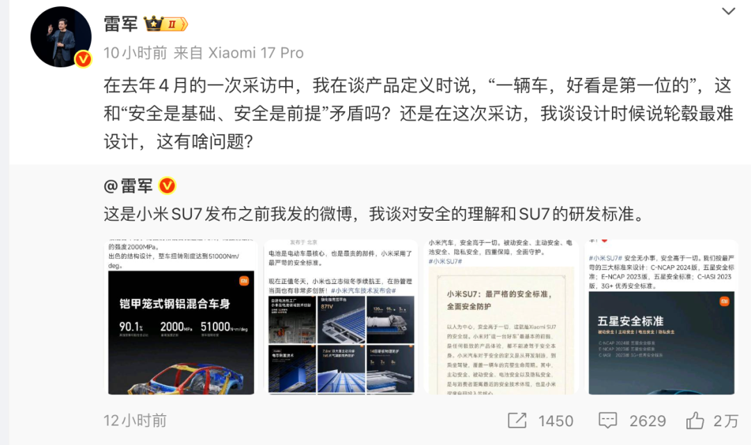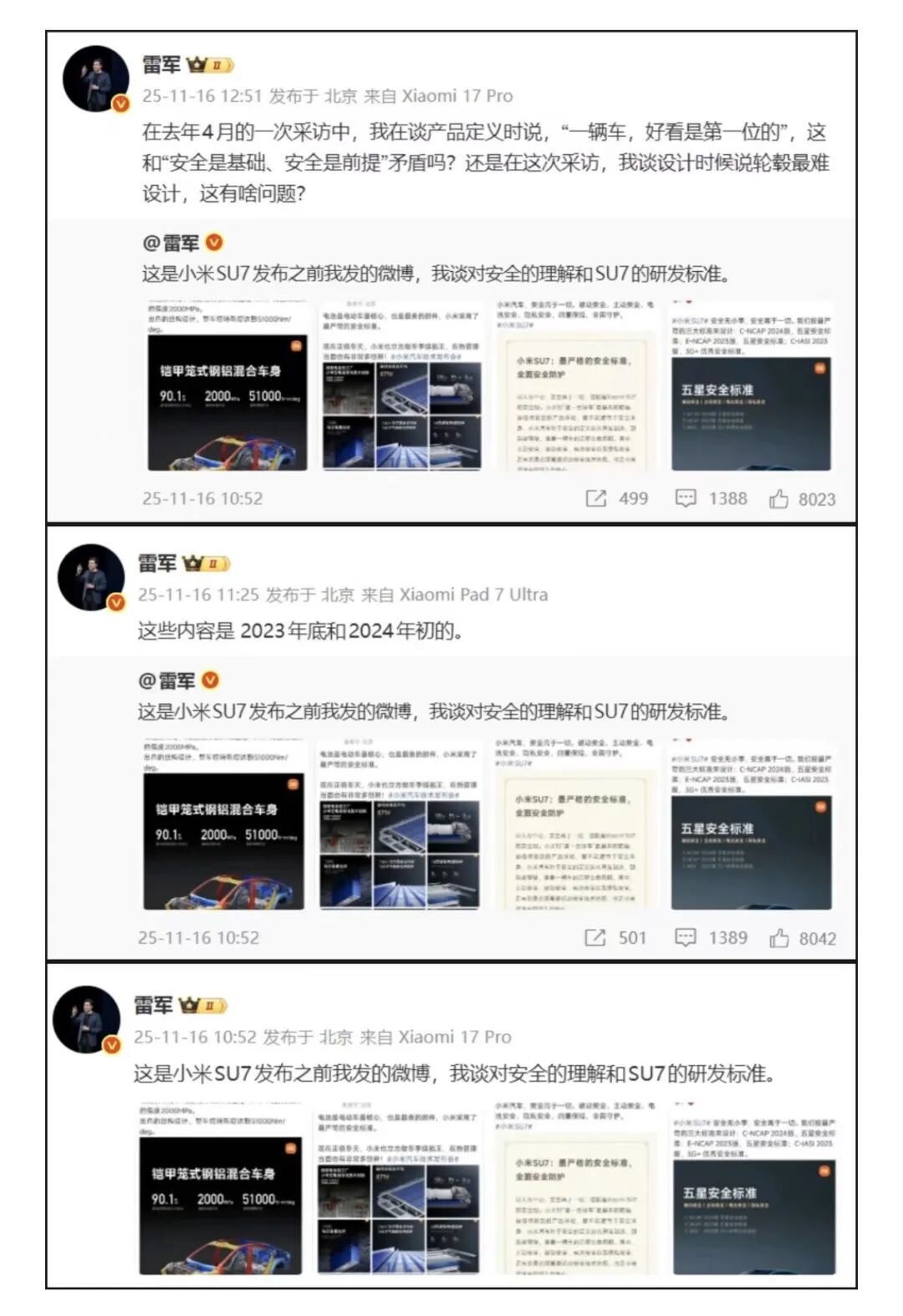 对于网上围绕小米汽车的“安全不如颜值”论调越传越烈,雷军索性把去年、今年谈安全的微博一口气晒了出来。