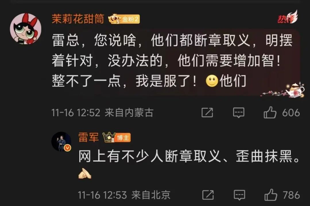 11月16日中午,雷军连发多条微博,语气罕见地锋利。