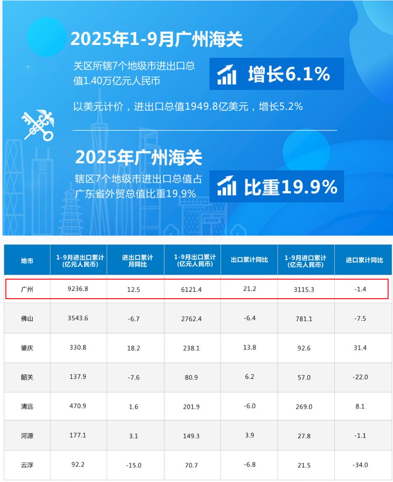 广州海关数据显示,前三季度广州进出口规模9236.8亿元,同比增长12.5%。其中出口6121.4亿元,同比增长21.2%。