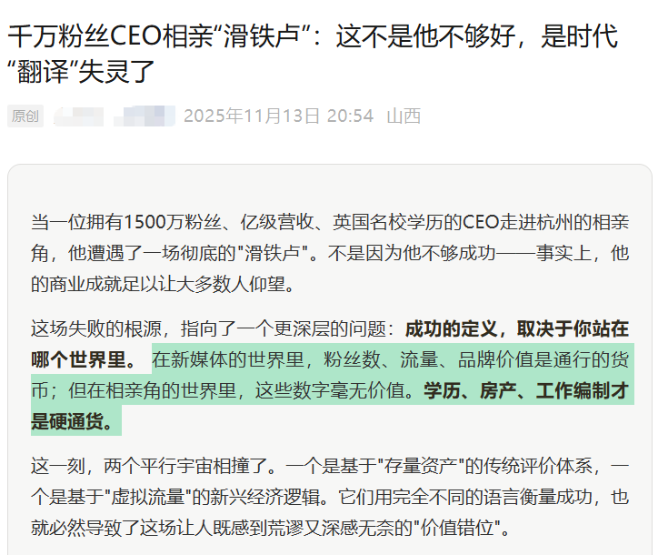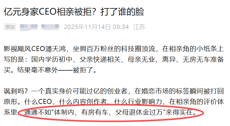 非要说他是故意去批判相亲体系、批评这里的人都势利眼,多少有点过度解读了。