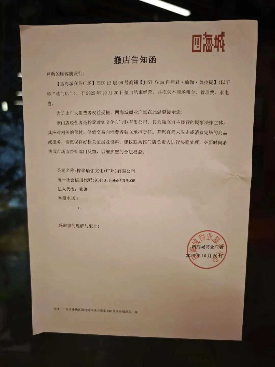 在“just yoga”紧闭的门上,张贴着物业公司的封条和一份撤店告知函。