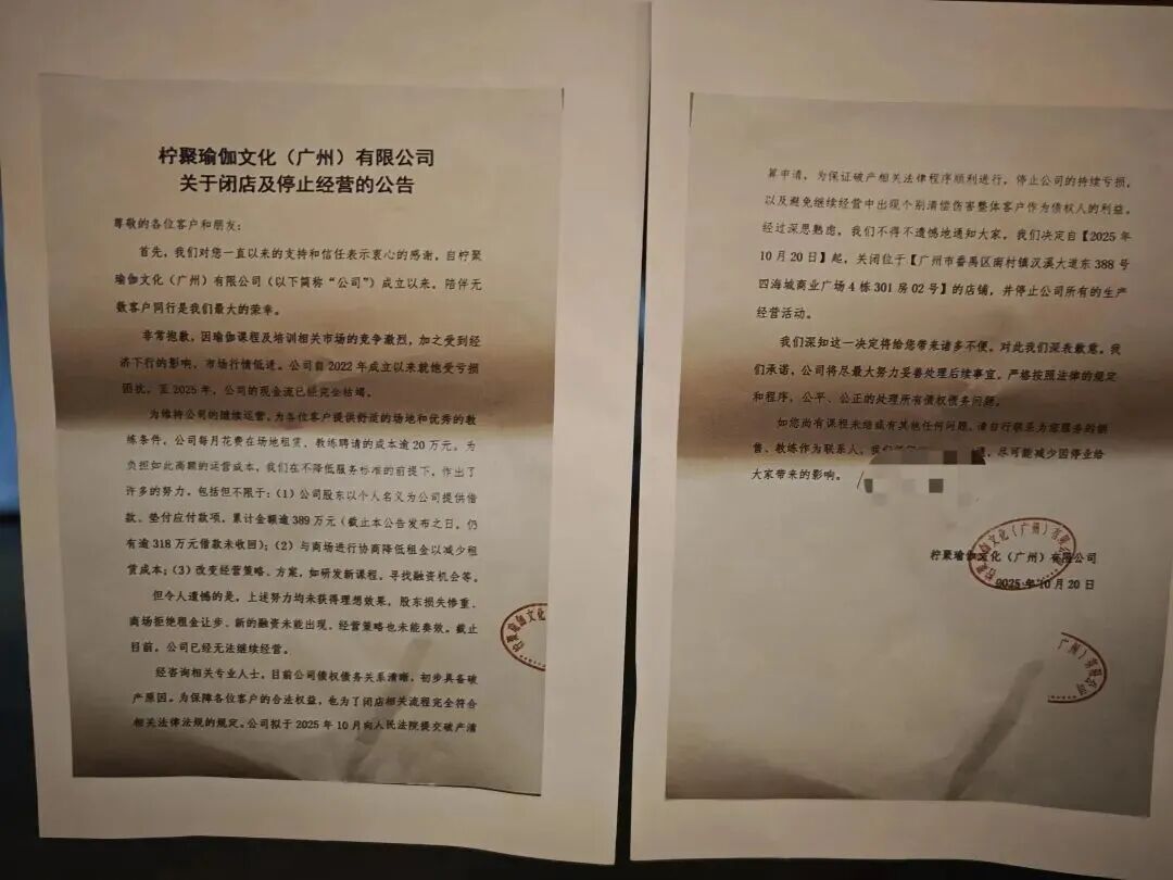 此外还有一份由瑜伽馆经营公司柠聚瑜伽文化(广州)有限公司的闭店公告。