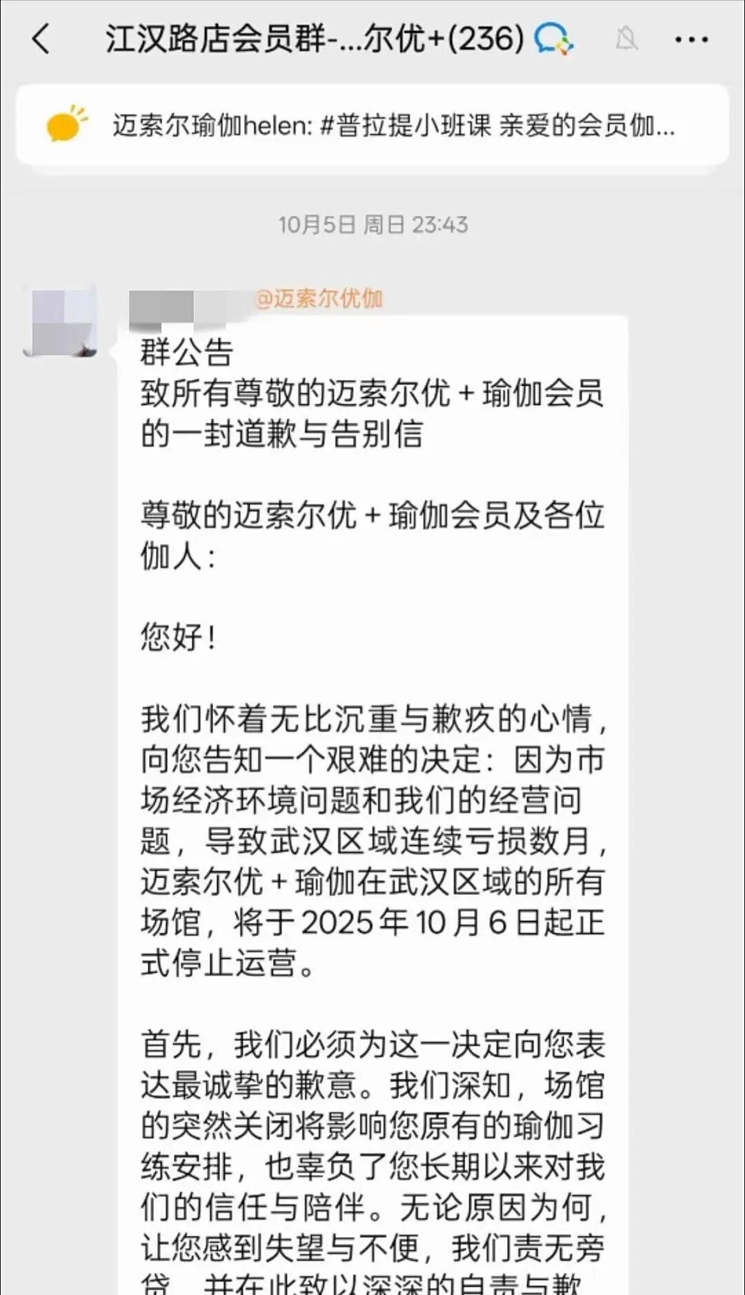 10月5日23点45分左右,迈索尔瑜伽在各店会员群突然发出一封“道歉与告别信”,宣布自10月6日起,该品牌在武汉的所有场馆全面停止运营。