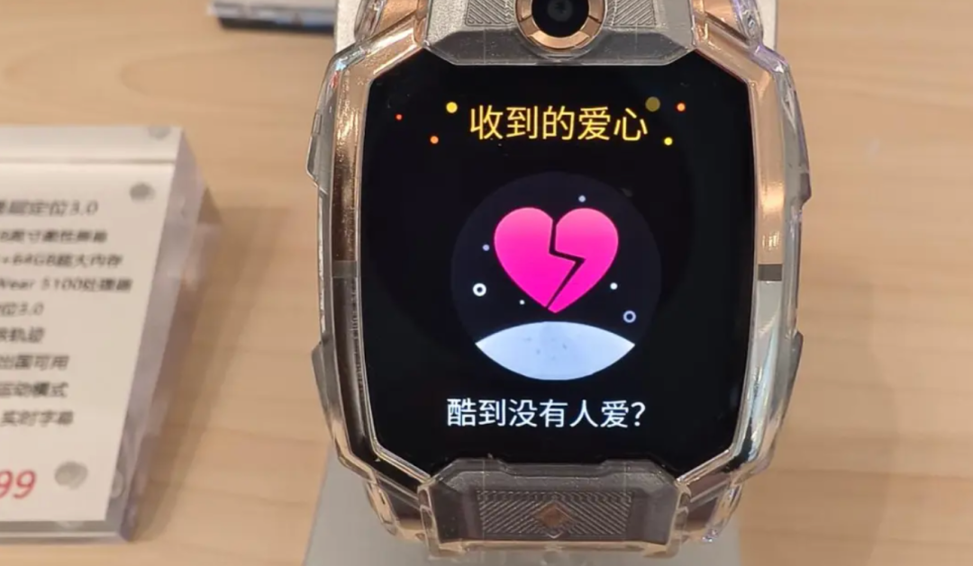至于孩子们为什么会如此沉迷。我们发现,当你发了一条好友圈却一个赞都没有时,小天才屏幕会显示一个粉色破碎爱心,配文为 “酷到没有人爱?”