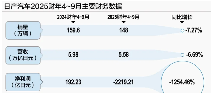 是的,日产最新发布的2025财年半年报(4月至9月)显示,公司净亏损高达2219亿日元(约合人民币103亿元),而去年同期为盈利192亿日元,这也是日产五年来的首次半年报亏损。预计全年经营亏损将达2750亿日元。