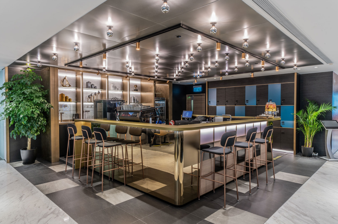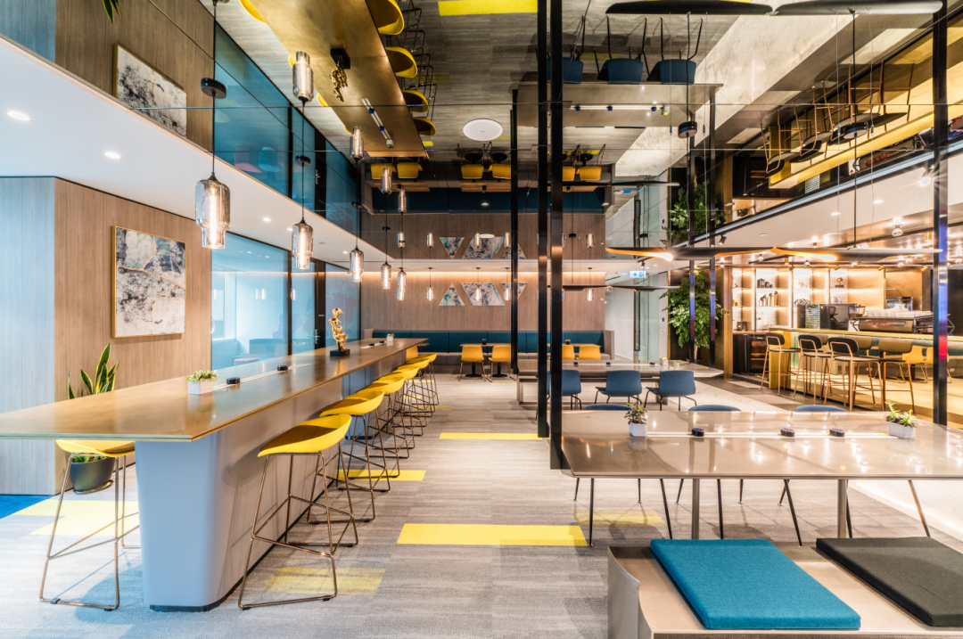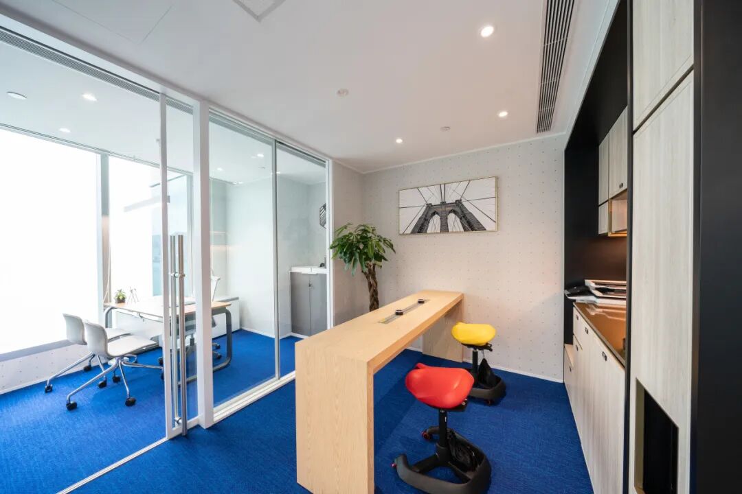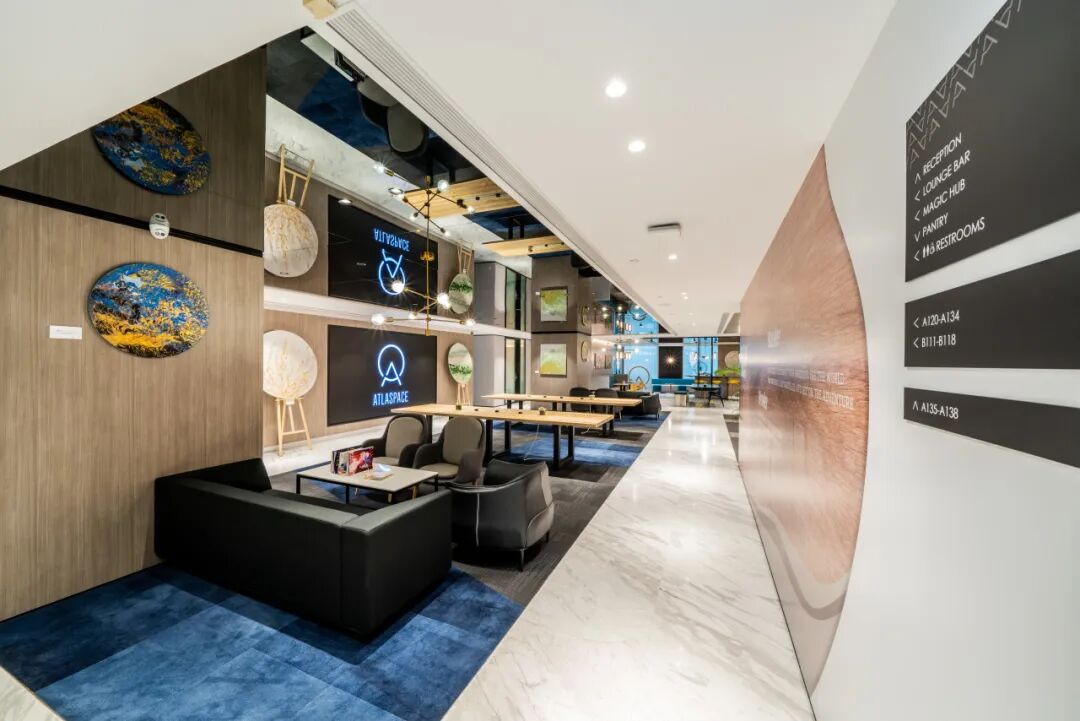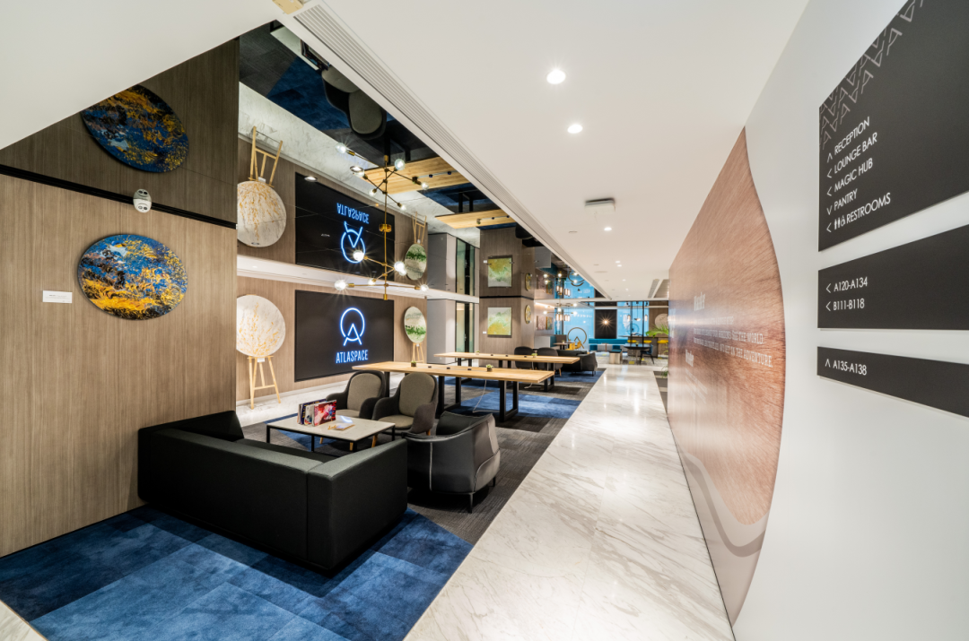 整个办公空间引入了高科技办公设施和国际品牌 IT 设备,配备 Magic Hub、酒廊、会议室等多个功能区,旨在帮助客户打破空间限制,满足不同规模企业和个人办公的需求。