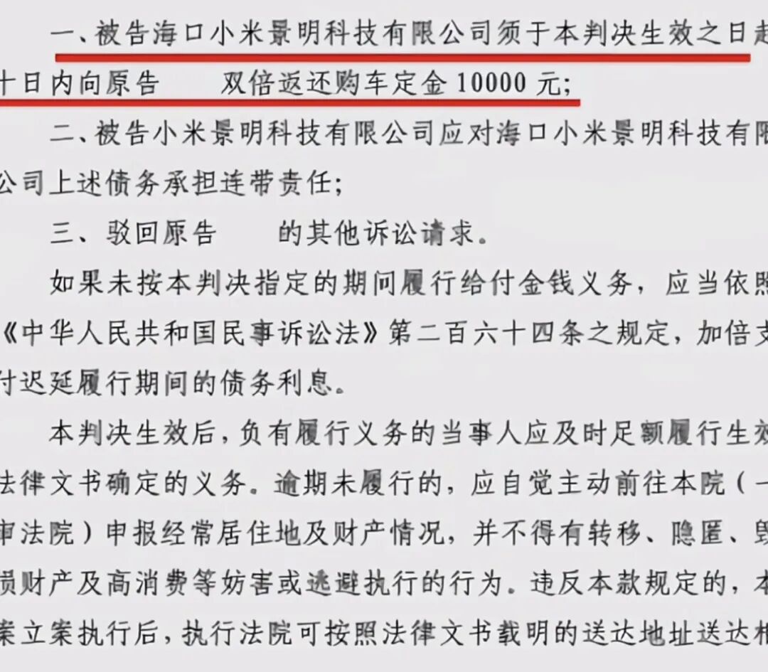 最终,小米被判双倍退还定金1万元。