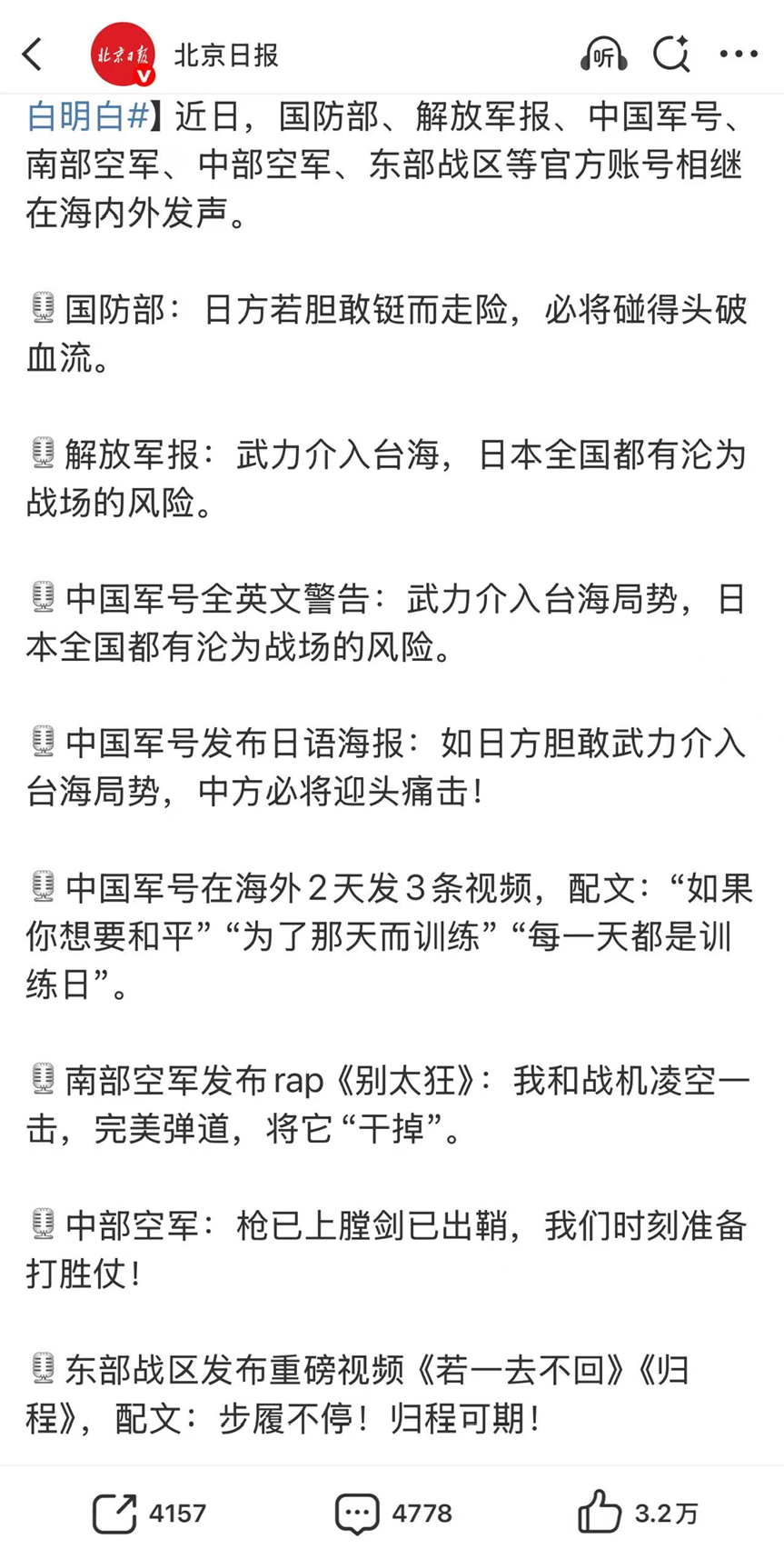 日本首相高市早苗逆天言论引起的风波仍在持续。解放军持续警告日本,国防部、解放军报、东部战区等官方账号在海内外相继发声。