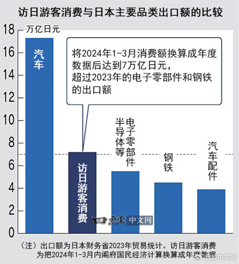 不要小瞧文旅反制的影响力,去年一季度,访日游客名义消费换算成年度数据为7.2万亿日元,超过了半导体行业出口,成为仅次于汽车出口的第二大行业,旅游业成了日本名副其实的“支柱行业”。