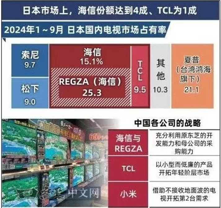 今年二月,松下宣布放弃电视业务,曾经风靡全球的松下电视成为历史。2024年前三季度,海信集团旗下品牌占据日本电视市场40.4%的份额。