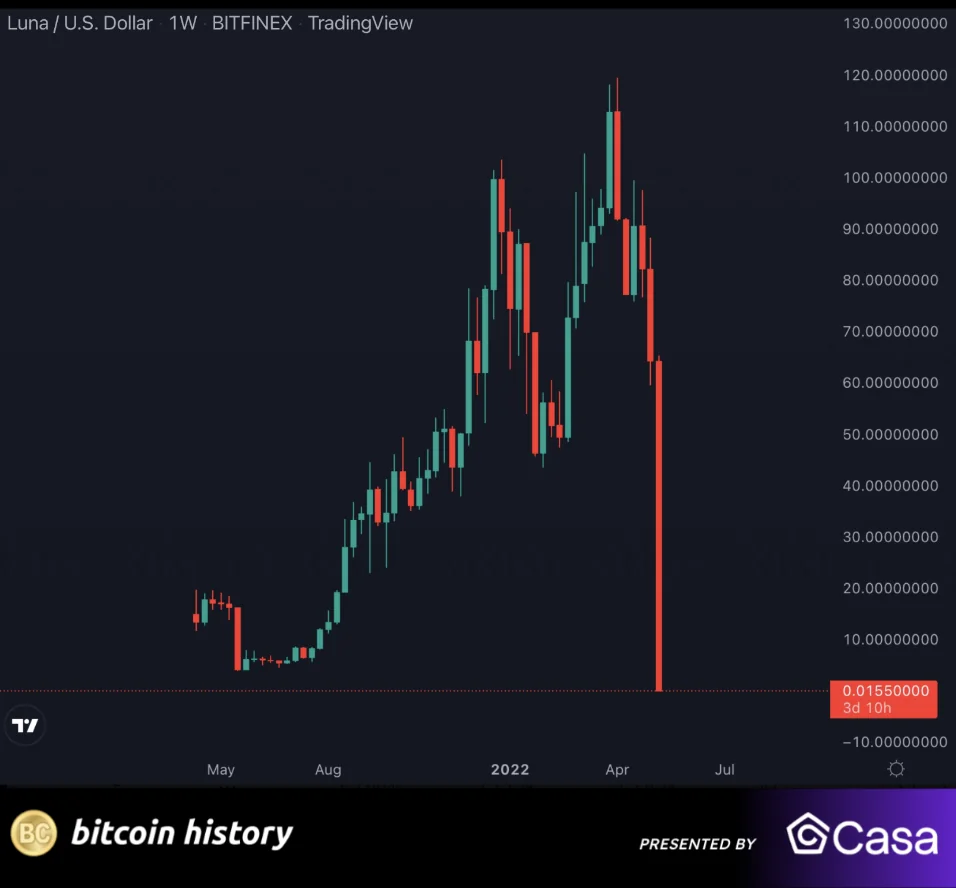 仅几天时间,LUNA 价格就从接近 90 美元一枚跌到了不足 0.015 美元一枚,价格几乎归零,曾经市值高达400亿美元的 LUNA 生态瞬间灰飞烟灭,无数人血本无归。
