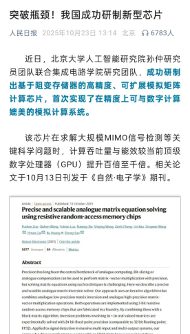 10月23日,《人民日报》报道称,北大等研究人员成功研制出新的计算芯片,首次实现了在精度上可与数字计算媲美的模拟计算系统,能为现在的算力与人工智能等前沿科技发展提供更精准的计算服务;
