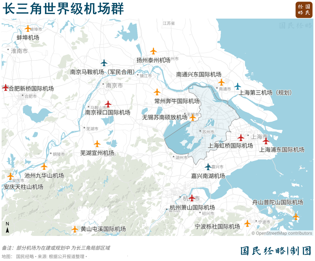 加上在建、规划新建的上海第三机场(南通新机场)、南京马鞍机场、安徽宿州机场等,未来几年长三角至少将有34座机场。